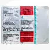Apriglim MV 2 Tablet is a combination of three oral antidiabetic drugs: glimepiride, voglibose, and metformin. Together, they help improve glycemic control in type II diabetes mellitus patients.