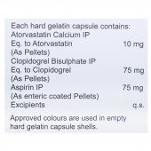 Each hard gelatin capsule contains- Atorvastatin calcium equivalent to Atorvastatin 10 mg (As pellets), Clopidogrel Bisulphate equivalent to Clopidogrel 75 mg (As Pellets) and Aspirin 75 mg (As enteric coated Pellets).