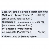 Each uncoated bilayered Dianorm Total 30 mg tablet contains Gliclazide 30 mg (In sustained-release form), Pioglitazone Hydrochloride equivalent to Pioglitazone 15 mg, Metformin Hydrochloride 500 mg (In sustained-release form) and Excipients q.s.