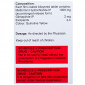 Each film coated bilayered tablet contains: Metformin Hydrochloride (as prolonged release) 1000 mg, Glimepiride 2 mg, and Excipients q.s.