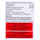 Each uncoated bilayered tablet contains- Glimepiride: 2 mg, Voglibose: 0.2 mg, Metformin Hydrochloride (As Extended Release): 500 mg and Excipients q.s.