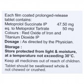 Each film coated prolonged-release tablet contains- Metoprolol Succinate: 47.50 mg equivalent to Metoprolol Tartrate: 50 mg.