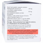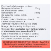 Each hard gelatin capsule contains- Rabeprazole Sodium (as enteric coated pellets): 20 mg, Domperidone (as sustained release pellets): 30 mg, and Excipients: q.s.