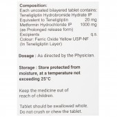 Each uncoated bilayered tablet contains- Teneligliptin Hydrobromide Hydrate equivalent to Teneligliptin: 20 mg, Metformin Hydrochloride (As Prolonged release form): 1000 mg and Excipients q.s.