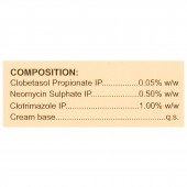 Clobetasol Propionate: 0.05% w/w, Neomycin Sulphate: 0.05% w/w, Clotrimazole: 1.00% w/w, Cream base: q.s.