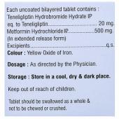 Each uncoated bilayered tablet contains: Teneligliptin Hydrobromide Hydrate equivalent to Teneligliptin 20 mg, Metformin Hydrochloride (In Extended Release form) 500 mg.