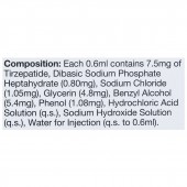 Each 0.6 ml contains 7.5 mg of Tirzepatide, Dibasic Sodium Phosphate Heptahydrate (0.80 mg), Sodium Chloride (1.05 mg), Glycerin (4.8 mg), Benzyl Alcohol (5.4 mg), Phenol (1.08 mg), Hydrochloric Acid Solution (q.s.), Sodium Hydroxide Solution (q.s.), Water for Injection (q.s. to 0.6 ml)