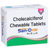 San D 60K Chewable Tablet is used for the treatment of vitamin D deficiency. San D 60K Chewable Tablet enhances the absorption of calcium and phosphate in the intestines, helping to prevent various bone disorders while promoting healthy bones, muscles, and nerves. Additionally, San D 60K Chewable Tablet aids in treating conditions like hypoparathyroidism and hypophosphatemia and supports immune system function.