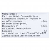 Each hard gelatin Capsule contains Esomeprazole Magnesium Trihydrate equivalent to Esomeprazole (as enteric coated pellets): 40 mg, Domperidone (as sustained release pellets): 30 mg and Excipients q.s.