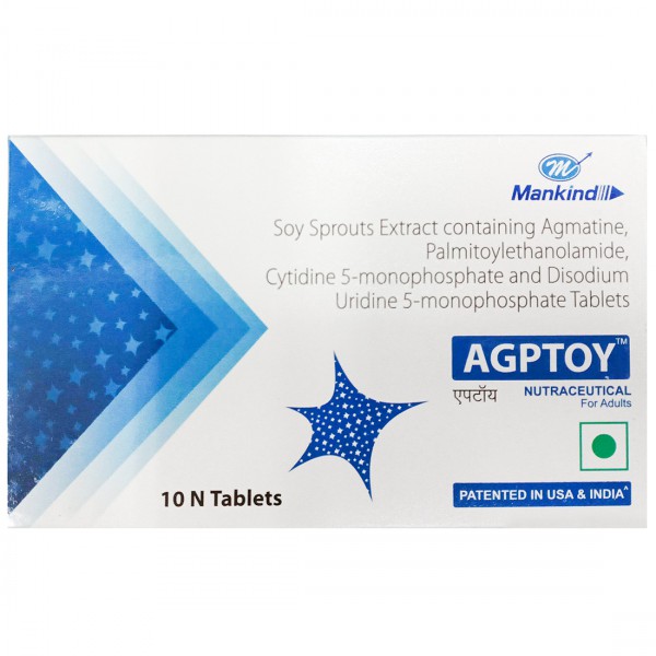 Agptoy Tablet is a nutraceutical supplement, enriched with soy, sprouts extract containing agmatine, palmitoylethanolamde, cytidine 5-monophosphate and disodium uridine 5-monophosphate. This product contains ingredients that are intended to support health function.