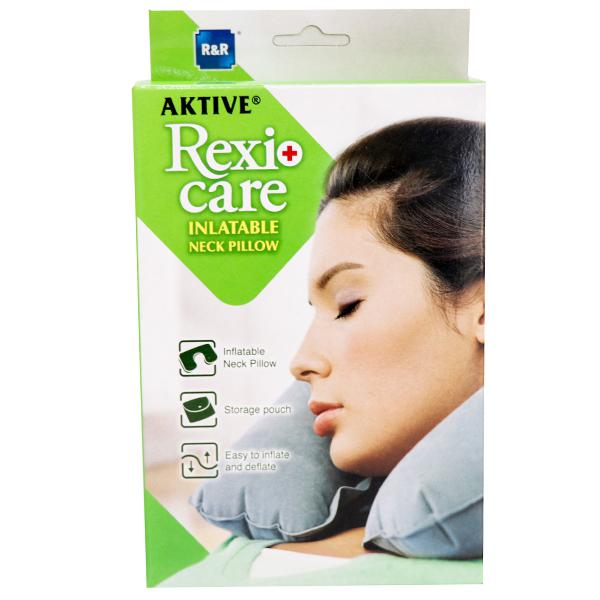 Aktive Rexio Care Inflatable Neck Pillow Salient features of Aktive Rexio Care Inflatable Neck Pillow:Cradles the head and neck comfortably.Suitable for traveling by anyway.Easy to inflate and deflate.Ergonomically designed to give proper support on the go. Direction for use:Inflation: 1) Pull up the valve. 2) Inflate with air to about 80% full before using. 3) Push down the valve to close. Deflation: 1) Pull up the valve. 2) Press the bottom of the valve to deflate. Safety information:Hand wash with mild detergent and then dry in shade.While inflating do not inflate excessively. It may cause damage to the product. Do not puncture the product with a sharp object. Children to use under adult supervision.