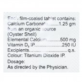 Calcium Carbonate from an organic source (Oyster Shell): 1.25 g, Elemental Calcium: 500 mg, Vitamin D3: 250 IU, Excipients: q.s.
