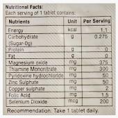 Energy: 1.1 Kcal, Carbohydrate (sugar-0 g): 0.275 g, Protein: 0 g, Fat: 0 g, Magnesium Oxide: 375 mg, Thiamine Mononitrate: 300 mg, Pyridoxine hydrochloride: 50 mg, Zinc Sulphate: 50 mg, Copper Sulphate: 2 mg, Folic Acid: 1.5 mg, Selenium Dioxide: 200 mcg