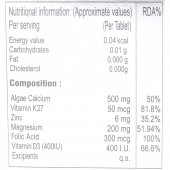 Algae Calcium: 500 mg, Vitamin K27: 50 mcg, Zinc: 6 mg, Magnesium: 200 mg, Folic Acid: 300 mcg, Vitamin D3: 400 I.U., Excipients: q.s.