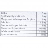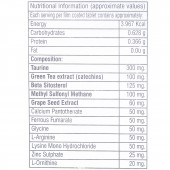 Taurine: 300 mg, Green Tea extract (catechins): 100 mg, Beta Sitosterol: 125 mg, Methyl Sulfonyl Methane: 100 mg, Grape Seed Extract: 60 mg, Calcium Pantothenate: 50 mg, Ferrous Fumarate: 50 mg, Glycine: 50 mg, L-Arginine: 50 mg, Lysine Mono Hydrochloride: 50 mg, Zinc Sulphate: 25 mg, L-Ornithine: 20 mg, Biotin: 5 mg, Pyridoxine Hydrochloride: 3 mg, Manganese as Manganese Sulphate: 2 mg, Folic Acid: 1.5 mg, Copper as Copper Sulphate: 1 mg, Chromium Polynicotinate: 200 mcg, L-Selenomethionine: 150 mcg, Cyanocobalamin: 15 mcg.