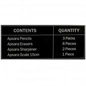 Pack contains -3 Apsara Pencils , Apsara Erasers-6, Apsara Sharpner-2, Apsara Scale 15cm-1