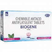 Biogene Mint Flavour Chewable Tabletis used as an antacid and antiflatulent agent to provide relief from acid-related gastrointestinal disorders. It works by neutralizing existing gastric acid, increasing the pH of the stomach contents, and relieving the symptoms of hyperacidity. It also effectively and quickly relieves heartburn, acid indigestion, and symptoms associated with gas (flatulence, bloating). It manages discomfort and pain caused by high acid levels in the stomach and alleviates symptoms of gastroesophageal reflux disease.