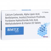 BMTZ Tablet is formulated with Calcium Carbonate, Alpha Lipoic Acid, Benfotiamine, Inositol,Chromium Picolinate, Pyridoxine Hydrochloride, Folic Acid, Methylcobalamin & Vitamin D3 . It helps to replenish nutritional deficiencies improve different disease condition and support overall health scenario of an individual.