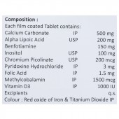 Calcium Carbonate: 500 mg, Alpha Lipoic Acid: 200 mg, Benfotiamine: 150 mg, Inositol: 100 mg, Chromium Picolinate: 200 mcg, Pyridoxine Hydrochloride: 3 mg, Folic Acid: 1.5 mg, Methylcobalamin: 1500 mcg, Vitamin D3: 1000 IU, Excipients: q.s