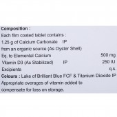 1.25 g of Calcium Carbonate from an organic source (As Oyster Shell) Eq. To Elemental Calcium: 500 mg, Vitamin D3 (As Stabilized): 250 IU and Excipients q.s.