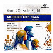 Caldikind 60K Nano Sugar Free Litchi Flavour Oral Solution is a ready to drink single dose solution. It nano technology form formulated with Vitamin D3( Cholecalciferol) that has numerous health benefits. It used to treats and prevents of vitamin D deficiency states. It enhance intestinal calcium and phosphorous absorption, helps in the formation of strong bones & teeth. It boost immunity to fight against infections. It promotes absorption of calcium in muscles, thus improves the functioning of muscles. It is essential to supports overall growth and development of an individual.