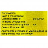 Cholecalciferol (In nano droplet form): 60,000 I.U., In a flavour syrup base: q.s.