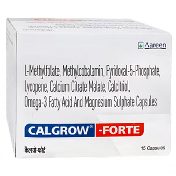 Calgrow Forte Capsule is advised to treat and prevent nutritional deficiencies. It is formulated with L-Methylfolate, Methylcobalamin, Pyridoxal-5-Phosphate, Lycopene, Calcium Citrate Malate, Calcitriol, Omega-3 Fatty Acid and Magnesium Sulphate which helps to treat low calcium and phosphate levels in the body. It helps in improving bone strength, neurological health, and heart health. It manage the neuropathic pain due to nervous tissue damage, maintain homocysteine levels supporting cardiovascular health, helps in preventing bone-related disorders like osteoporosis or osteomalacia, and promotes strengthening of bone.