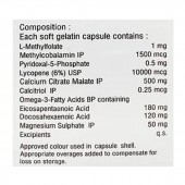 L-Methylfolate: 1 mg, Methylcobalamin: 1500 mcg, Pyridoxal-5-Phosphate: 0.5 mg, Lycopene (6%): 10000 mcg, Calcium Citrate Malate: 500 mg, Calcitriol: 0.25 mcg.