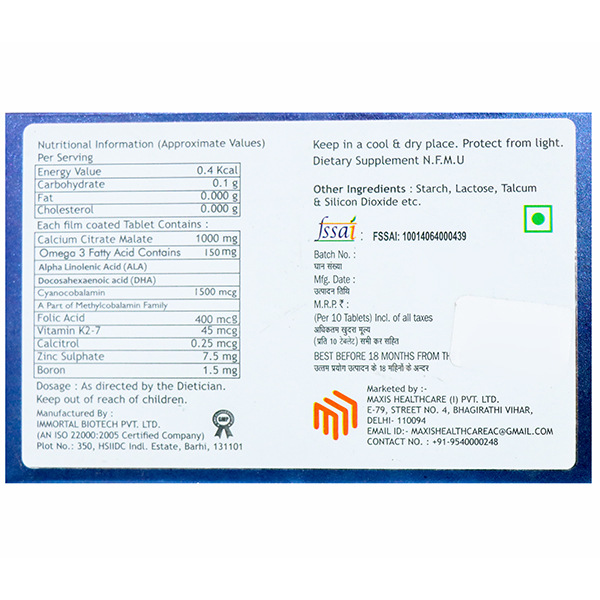 • Generic Name: Boron 1.5mg + Calcitriol 0.25mcg + Calcium Citrate Malate 1000mg + Cyanocobalamin 1500mcg + Folic Acid 400mcg + Omega 3 Fartty Acid 150mg + Vitamin K2-7 45mcg + Zinc Sulphate 7.5mg