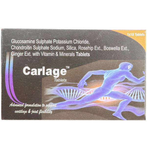 Carlage Tablet is an advanced formulation of Glucosamine Sulphate Potassium Chloride, Chondroitin Sulphate Sodium, Silica, Rosehip Ext., Boswella Ext., Ginger Ext. with vitamin & minerals that supports cartilage & joint flexibility.