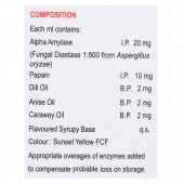 Alpha Amylase: 20 mg (Fungal Diastase 1:800 from Aspergillus oryzae), Papain: 10 mg, Dill Oil: 2 mg, Anise Oil: 2 mg, Caraway Oil: 2 mg, Flavoured Syrup Base: q.s.