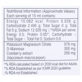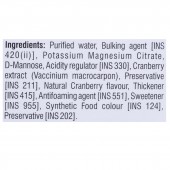Purified water, Bulking agent [INS 420 (i i)], Potassium Magnesium Citrate, D-Mannose, Acidity regulator [INS 330], Cranberry extract (Vaccinium macrocarpon), Preservative [INS 211], Natural Cranberry flavour, Thickener [INS 415], Antifoaming agent [INS 551], Sweetener [INS 955], Synthetic Food colour [INS 124], Preservative [INS 202].