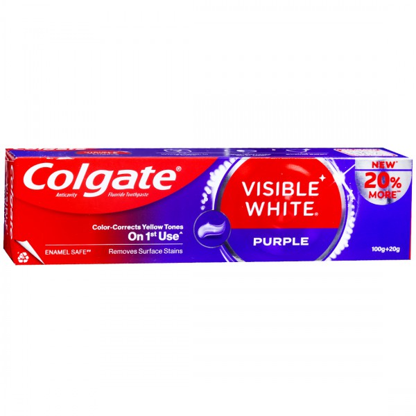 Colgate Visible White Purple Toothpaste is an anti-cavity, foaming fluoridated toothpaste that removes surface stains. It is safe for the enamel, corrects yellow tones on the first use, and results in whiter teeth in 7 days.