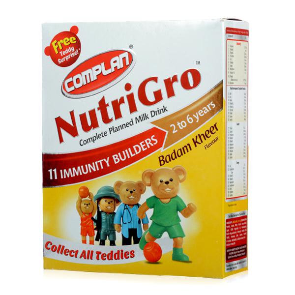 It is enriched with 11 Immunity builders Copper, Zinc, FOS(Fructo Oligosaccharide), Selenium, Beta-Carotene, Probiotic (Bifidobacterium lactic), Necleotides, Vitamin A, C, E and Molybdenum that helps build internal resistance power against common conditions like cold, cough & mild infections.. It has 5 key growth nutrients (Iron, Vitamin B1, Vitamin B2, Vitamin B6 and Vitamin B 12) based on Indian RDA, 2010. Complan NutriGro is to be taken as part of daily balanced diet. It has DHA for brain development and functioning. It initiates better growth with 39 vital nutrients along with 100% milk protein. It is easy to digest with whey protein, prebiotic and probiotic. It comes in delicious homely style badam kheer flavour that your kid will love and will not be able to resist.