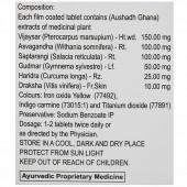 Each film-coated tablet contains (Aushadh Ghana) extracts of medicinal plant: Vijaysar (Pterocarpus marsupium)-Ht.wd: 150.00 mg, Asvagandha (Withania somnifera)-Rt.:100.00 mg, Saptarangi (Salacia reticulata)-Rt: 100.00 mg, Gudmar (Gymnema sylvestre)-Lf: 50.00 mg, Haridra (Curcuma longa)-Rz: 25.00 mg,