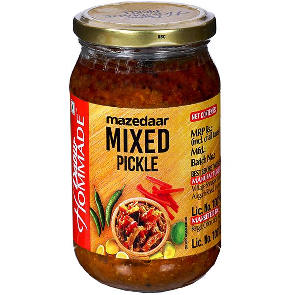 Product Information- Dabur Hommade Mixed Vegetable Pickle brings you the perfect mix of Mango, Carrot, Lemon and Chili with a blend of zesty spices. It instantly becomes a perfect accompaniment to your everyday meals. Mixed Pickle can be an accompaniment to lunch, breakfast or dinner routines. It adds a zingy & zesty flavourful punch to your meals.
