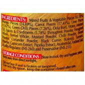 Ingredients- Mixed Fruits & Vegetable Pieces [Mango Pieces, Carrot Pieces, Lime Pieces, Green Chilli Pieces, Dela fruit], Water, Spices & Condiments [Fenugreek Powder, Fenugreek Whole, Fennel Whole, Mustard Powder, Fennel Powder, Chilli Powder, Coriander Powder, Black Cumin (Kalonji), Turmeric Powder, Capsicum Extract, Paprika Extract, Asafoetida], Iodised Salt, Acidity Regulator (INS 260), Mustard Oil and Preservative (INS 211).