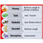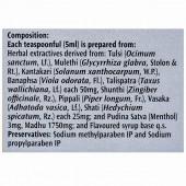 Herbal extractives derived from Tulsi (Ocimum Sanctum, Lf.), Mulethi (Glycyrrhiza glabra, Stolon & Rt.), Kantakari (Solanum Xanthocarpum, W.P.), Banaphsa (Viola odorata, Fl.), Talispatra (Taxus wallichiana, Lf.) each 50 mg, shunthi (Zingiber Officinale, Rz.) Pippali (Piper Longum, Fr.), Vasaka (Adhatoda Vasica, Lf.), Shati (Hydechium spicatum, Rz.) each 25 mg & Pudina Satva (Menthol) 3 mg, Madhu 1750 mg & flavoured syrup base q.s.