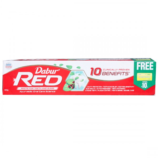 Dabur Red Toothpaste is an ayurvedic oral care toothpaste for teeth and gums protection. It is a clinically proven ayurvedic formula which provide 10 dental benefits such as cavity protection, toothache relief, soothes sensitivity, gum healthl, active freshness, teeth whitening, strong teeth, plaque control, fights germs, enamel care. It also has anti-inflammatory and anti-bacterial properties gives protection for the entire family.