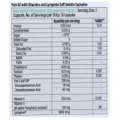 Energy: 6.93 Kcal, Carbohydrate: 0.020 g, Sugar: <0.1%, Added Sugar: 0 g, Total Fat: 0.407 g, Saturated Fat: 0.35 g, Trans Fat: 0.005 g, MUFA: 0.196 g, PUFA: 0.211 g, Cholesterol: 0.69 mg, Sodium: 0.03 mg, Protein: 0.009 g, Fish Lipid Oil: 300 mg, Eicosapentaenoic acid: 90 mg, Docosahexaenoic Acid: 60 mg, Vitamin C: 35.0 mg, Vitamin E (dl-alpha Tocopheryl acetate): 8.0 mg, Lycopene: 5000 mcg