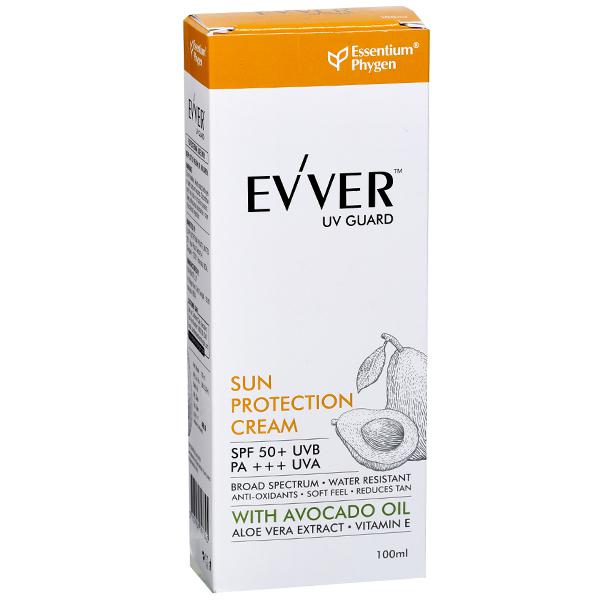EVVER UV GUARD SUN PROTECTION CREAM is an advanced plant profused sunscreen formulation which provides broad-spectrum protection against skin-ageing and skin-burning sunrays. It protects the skin from pigmentation and blemishes caused by UV rays. This soft-feel sunscreen is balanced with natural oils and extracts that also nourish the skin and remove tan. Polyhydroxylated Fatty Alcohols (PFA) in Avocado oil also repair damaged skin cells.