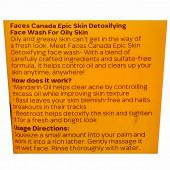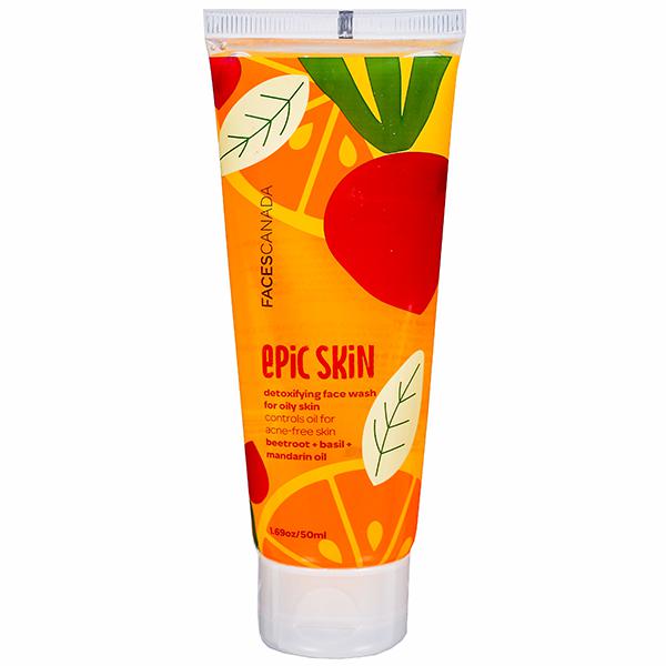 - For oily skin: Oily and greasy skin can't get in the way of a fresh look. Meet Faces Canada Epic Skin Detoxifying face wash. With a blend of carefully crafted ingredients and sulfate free formula, it helps control and clears up your skin anytime, anywhere! Mandarin oil present in this helps clear acne by controlling excess oil while improving skin texture. Basil leaves your skin blemish-free and halts breakouts in their tracks. Beetroot helps detoxify the skin and tighten it for a fresh and bright look.