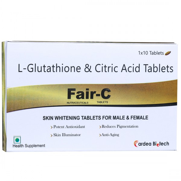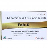 Fair C Tablet is a health supplement, enriched with L-Glutathione & Citric Acid, that helps in skin whiting and provide anti-oxidant and skin illuminator. It also reduces pigmentation & anti-aging.