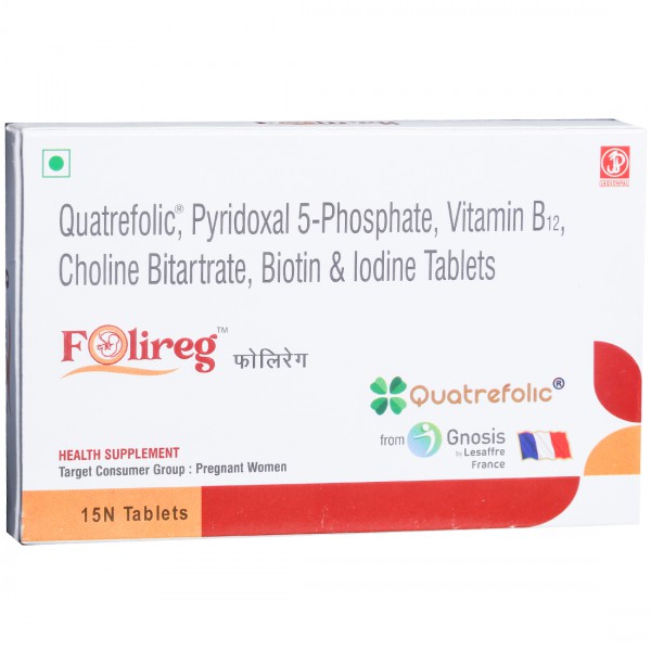 Folireg Tablet is a health supplement, enriched with Quatrefolie, Pyridoxal 5 Phosphate, Vitamin B12, Choline Bitartrat, Biotin & Iodine.