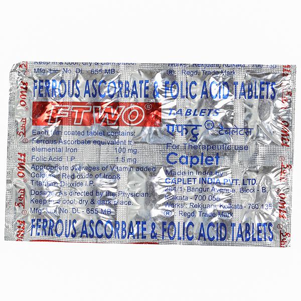 Each film coated Ftwo tablet contains Ferrous Ascorbate equivalent to Elemental Iron 100 mg and Folic acid 1.5 mg.