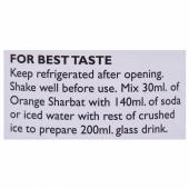 Shake well before use. Mix 30 ml of Orange sharbat with 140 ml of soda or iced water with the rest of the crushed ice to prepare a 200 ml glass drink.