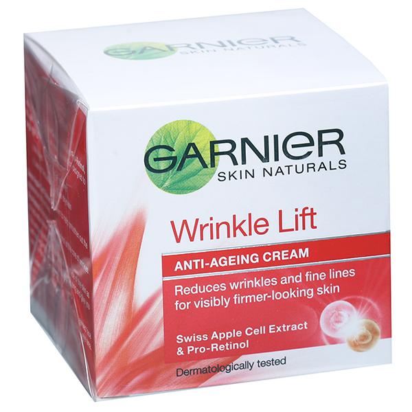 Tackle the most tiresome signs of ageing - wrinkles, fine lines, loss of firmness and skin dryness with Garnier Wrinkle Lift Anti-Ageing Cream. Enriched with Pro-Retinol derived from nature to increase cellular turnover, it visibly reduces wrinkles and fine lines to reveal a firmer-looking skin. The anti-wrinkle, firming actions works on 2 levels - it smoothens out the skin on the surface and reduces wrinkles from deep within. The cream has been dermatologically tested.