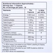 Energy: 1.583 kcal, Protein: 0.0158 g, Carbohydrates: 0.38 g, Total Sugar: 0.200 g, Added sugar: 0.0 g, Total Fat: 0.0 g, Sodium: 0.00 mg, Cranberry extract (Proanthocyanidins 20%): 200 mg, D-Mannose: 200 mg, Hibiscus extract (Polyphenols 4%): 100 mg