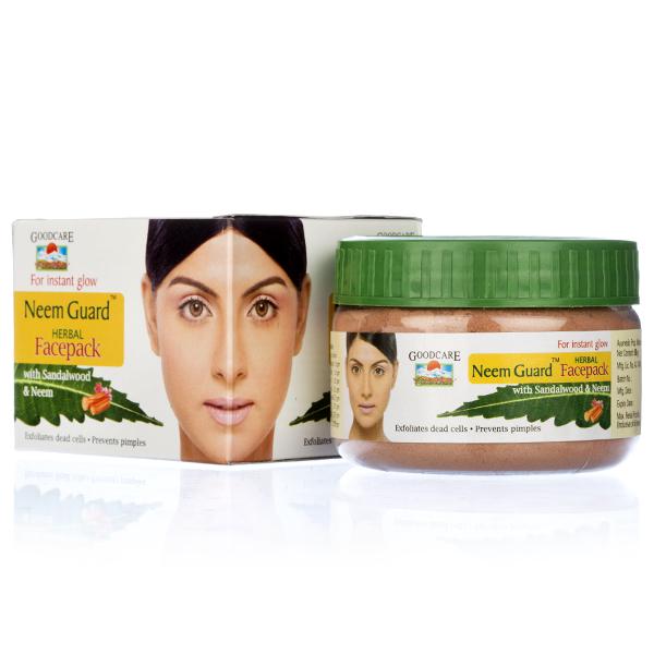 Neem Guard face pack from Goodcare Pharma is a herbal preparation for curing skin problems such as acne, pimples, blackheads and scars. It contains the goodness of sandalwood, manjishtha, neem, lodhra chaal and masoor dal that work together to exfoliate the dead skin cells, revealing a clear and glowing complexion like never before. The sandalwood acts as a sunscreen, which prevents the skin from premature drying. The anti-bacterial action of neem prevents rashes and pimples. Lodhra chaal and masoor dal are both helpful in skin diseases. Take two teaspoonfuls of the powder, add sufficient quantity of rose water to make a paste. Apply on face, keep it for 15 minutes and then wash face with cold water. It comes in a 50gm pack.