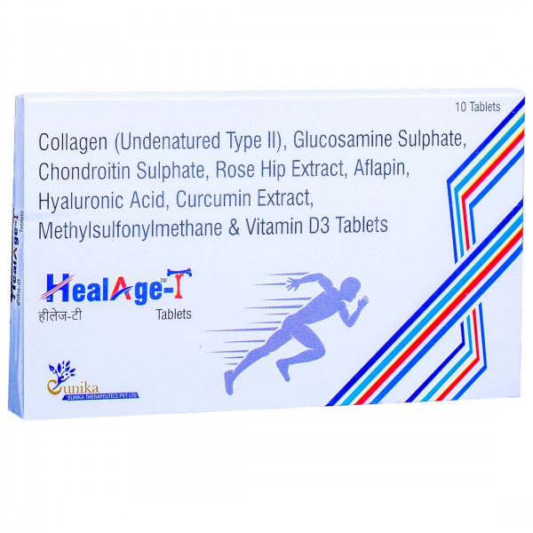 T Heal Forte Tablet is a dietary supplement, enriched with Collagen (Undenatured type II), Glucosamine Sulphate, Chondroitin Sulphate, Rose Hip Extract, Aflapin, Hyalulonic Acid, Curcumin Extract, Methylsulfonylmethane & Vitamin D3.